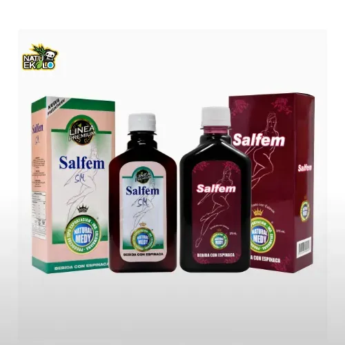 Salfem (Cólicos y Menopausia), Bebida con zumo de espinaca, extracto de manzanilla, canela y flor de Jamaica, componentes naturales antiespasmódicos (ayudan a calmar los cólicos menstruales), y estados críticos de la menopausia.