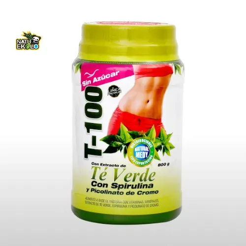 T-100 (Té Verde), alimento en polvo a base de proteína con vitaminas, minerales, extracto de té verde, espirulina y picolinato de cromo, sin azúcar.